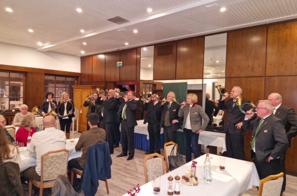 Die Jagdhornbläser der Kreisgruppe eröffneten die Feier mit festlichen Signalen und ausgewählten Stücken, die die lange Tradition jagdlichen Brauchtums eindrucksvoll erklingen ließen. Unter der Leitung von Gabriele Reichert begleiteten sie den gesamten Abend und verliehen der Feier eine stimmungsvolle und zugleich feierliche Atmosphäre.